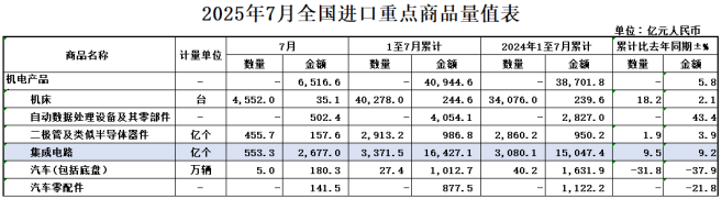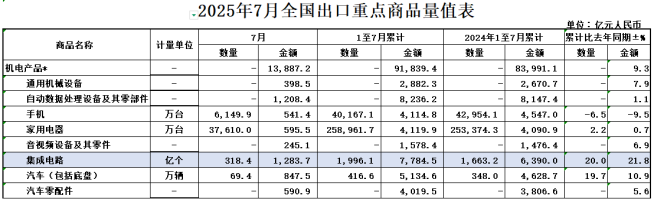 2025年1—7月,我国出口集成电路7784.5亿元,增长21.8%;进口集成电路16427.1亿元,增长9.2%