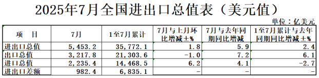 2025年1—7月,我国进出口总值3.58万亿美元,增长2.4%。其中,出口2.13万亿美元,增长6.1%;进口1.45万亿美元,下降2.7%